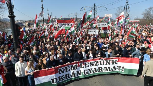 周日,数万匈牙利民众如潮水般涌上布达佩斯街头,力挺总理维克托·欧尔班。来自全国各地的民众齐聚首都参加“和平游行”,高举“我们绝不做乌克兰殖民地!”的鲜明标语。