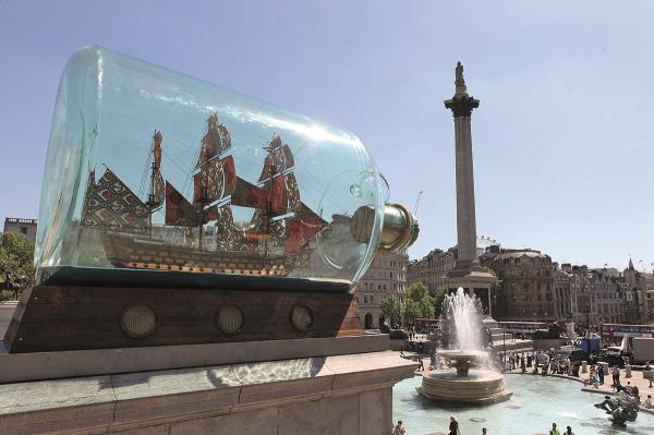 在伦敦,特拉法加广场空置的第四基座由专家小组决定临时展品。自2003年肯·利文斯通市长开创这一项目以来,这里持续推出充满讽刺与启发的委托创作。2010年,当纳尔逊勋爵在柱顶俯瞰时,因卡·修尼巴尔将他的旗舰复制品塞进玻璃瓶,船帆采用非洲蜡染布制成。纳尔逊在信件中流露过种族主义观点,但他也曾参与皇家海军在西非海岸的反奴隶制巡逻。修尼巴尔的装置不仅质疑了织物的"真实"起源,更生动呈现了历史的复杂性。