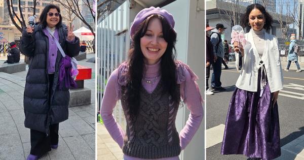 53岁的菲律宾粉丝玛丽亚两天前专程飞抵韩国,全身搭配紫色单品现身光化门广场。她手持阿米棒,身穿淡紫色开衫,手提浅紫手袋,连包挂饰都选用紫色系。为御寒准备的围巾更是选用了深紫色调。连靴子都精心搭配深紫色的玛丽亚兴奋表示:“特意为演出买了紫色短靴,今天是第一次穿!”言语间满是自豪。